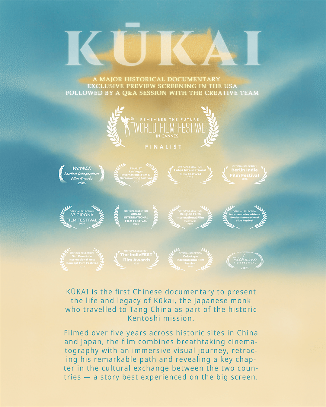 KŪKAI is a visually stunning documentary that brings to the screen the remarkable story of Kūkai, one of the most influential figures in Japanese cultural history. In 804 AD, he traveled from Japan to Tang China in search of knowledge, beginning a journey that would leave a lasting mark on art, learning, and cultural life across East Asia.