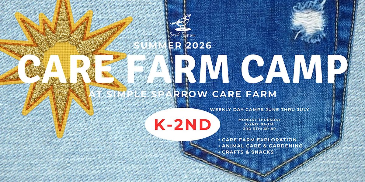 Simple Sparrow's Care Farm Camp for K-2nd is a Monday thru Thursday summer day camp specially designed for early elementary aged campers to explore the farm, learn the basics of helping and caring for a variety of animals, and "dig in" to beginning organic gardening. In addition to learning food, water, shelter, and community needs of the farm, campers will gain a better understanding of their own needs and the needs of others, improving social and emotional well-being. All abilities welcome: if your camper needs assistance, please email our office at [email protected] so we can best meet those needs. "Learn + Grow + Heal" with us this summer!