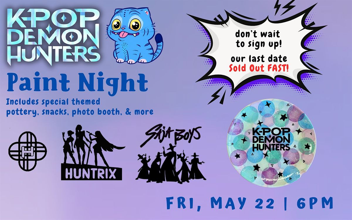 Join us for a K-pop Demon Hunters-themed event! Our last date sold out at 75 people! Do not wait to sign up! This evening includes themed pottery projects with a choice from tons of pottery painting ideas, including special items and projects just for this event. All are welcome to join in on the fun!