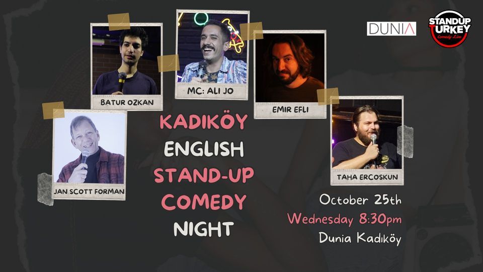Standup Turkey presents: Kadıköy wednesday night English stand-up comedy show! October 25th, Wednesday, 8:30 PM at Dunia Kadıköy.Tickets available at: https://biletino.com/en/e-r21/english-stand-up-comedy-show/