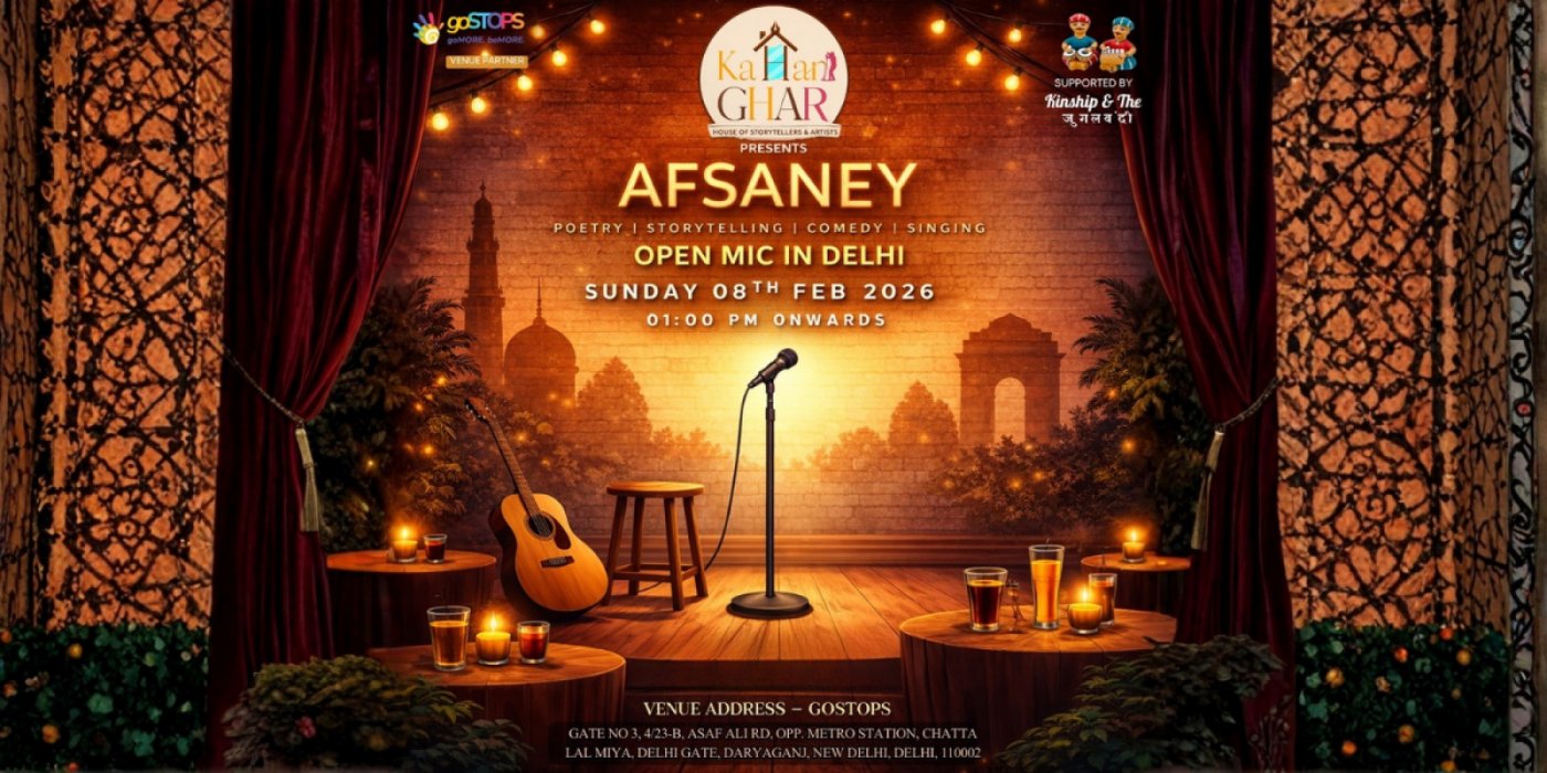 Kahani Ghar presents AFSANEY Open Mic — ek aisi shaam jahan kahaniyan bolti hain, shayari mehsoos hoti hai, gaane dil chhoo jaate hain aur comedy chehre par muskaan laati hai.