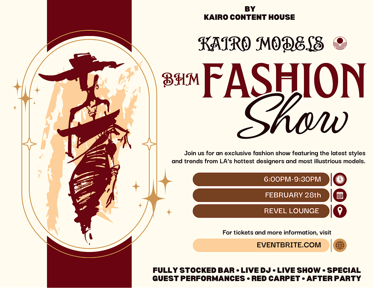 Join us for a night of fashion, fun, and culture as Kairo Models returns to the runway for the first time this year. Our show is one of a kind and features LA's hottest models, up-and-coming artists, and special guests all night long. Enjoy our fully stocked bar, live DJ , incredible atmosphere , and stick around for our after party taking place at the same venue. Come out and show love to our incredible models, designers and featured brands. Every member of Kairo Models displays black excellence and we need your support to pour back into the communities that shaped