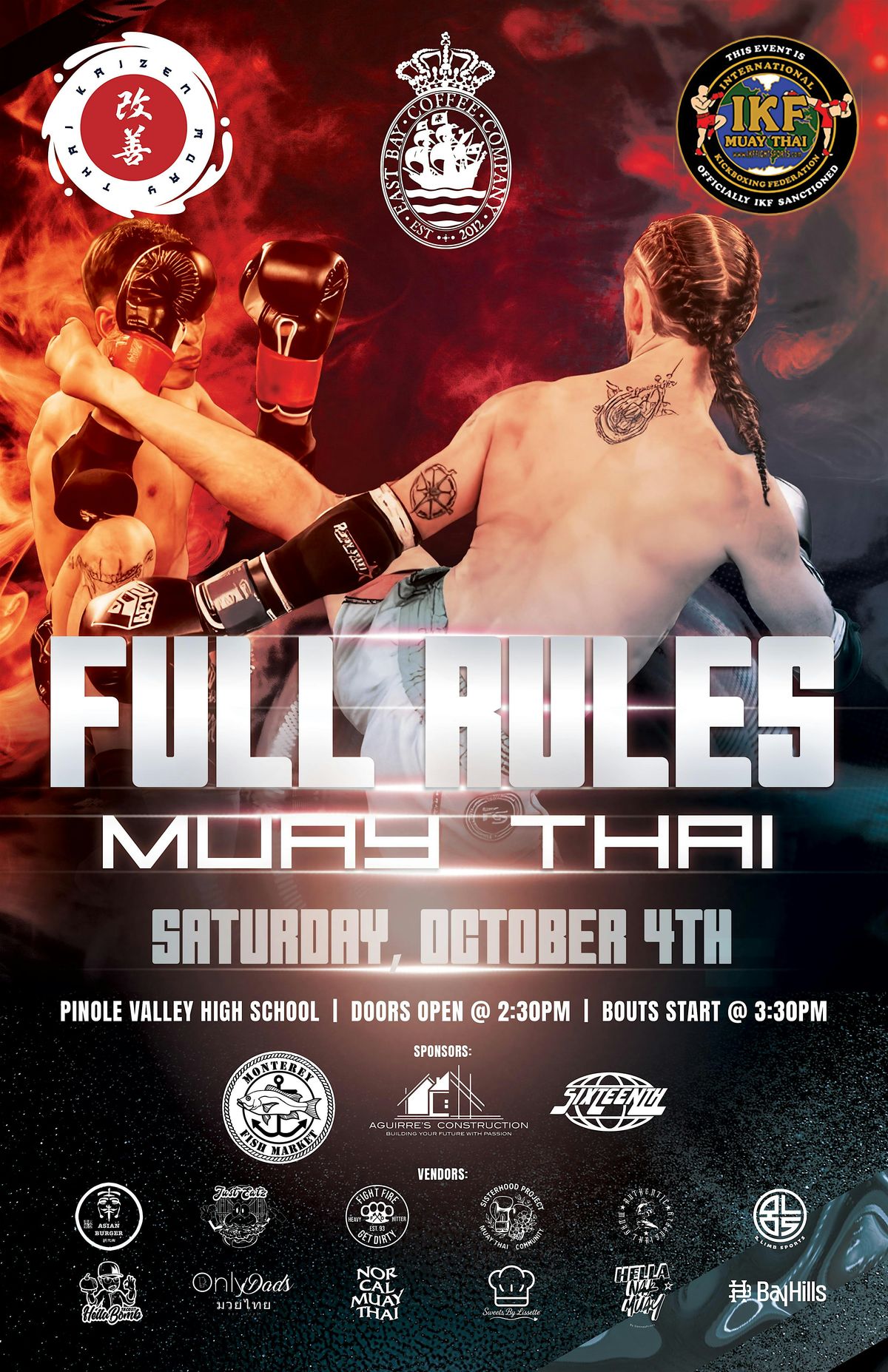 We are proud to present Kaizen Muay Thai. Hours of non stop Full Rules Muay Thai action, coming to Pinole, Ca.