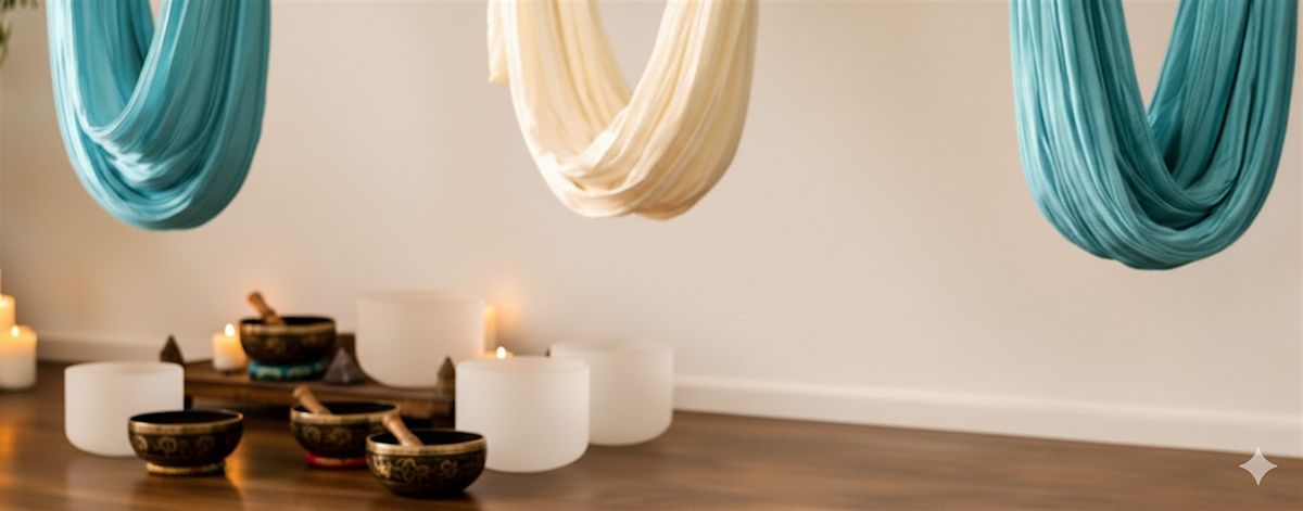 In diesem besonderen Soundbath liegt ihr geborgen in Aerial-Yoga-Tüchern / Hängematten und lasst euch von den Klängen tragen.