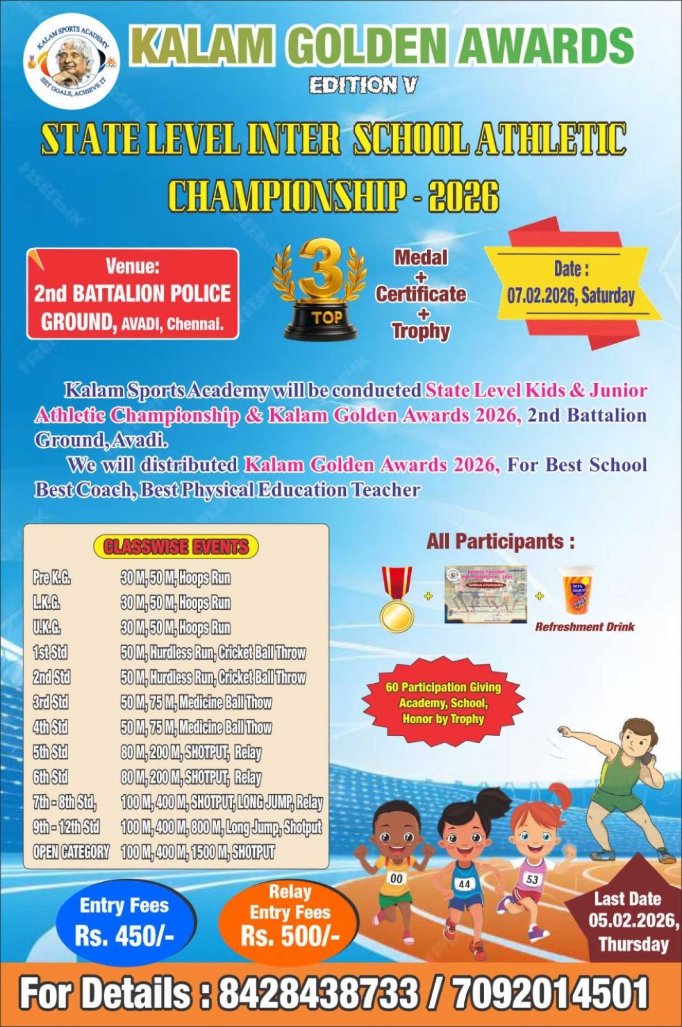 State Level Kids & Junior Athletic Championship Jan 2026 organised by Kalam Sports Academy on 7th Feb 2026 at 2nd Battalion Ground Avadi.
