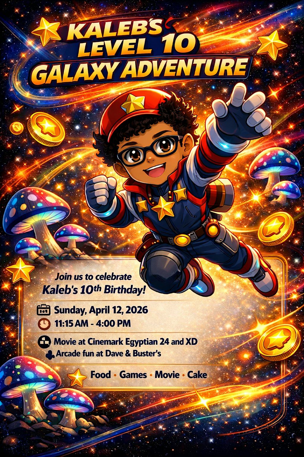 Get ready to blast off and join us in person for Kaleb's Level 10 Galaxy Party! We're celebrating big with tons of fun, cosmic vibes, and out-of-this-world excitement. Come hang out, enjoy some stellar tunes, and make memories across the galaxy with friends. Don’t miss this epic adventure—it's gonna be a total space party you won’t forget! There are limited space available so hurry and RSVP!!! Make sure to let us know if transportation is needed. We can arrange pick up from BIA West and drop off after the Party!