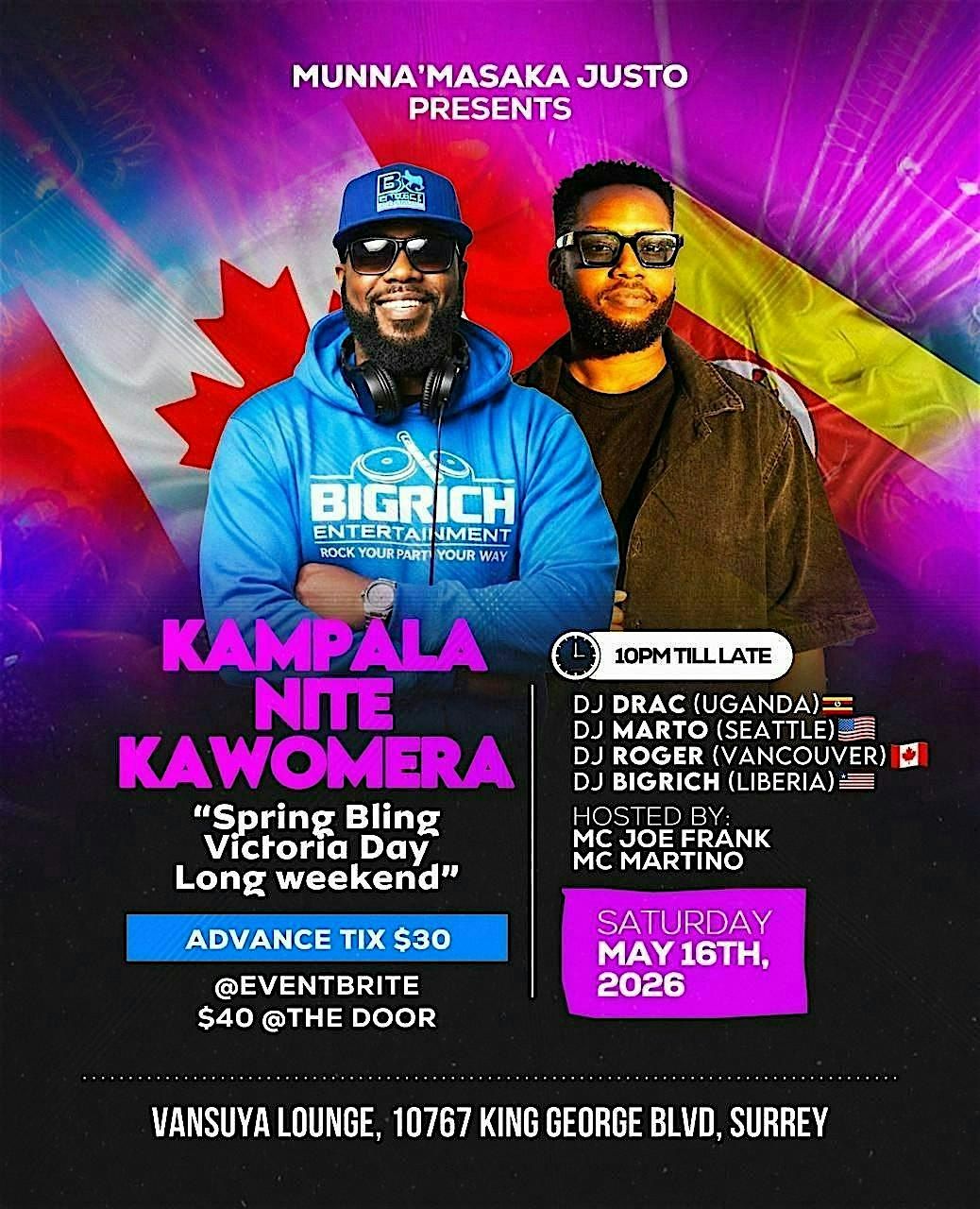 Music by DJ Drac (Vancity), DJ Marto (Seattle), DJ BigRich (Liberia) and DJ Roger (Kla'City)! Good vibes, good music, community engagement! Strictly Ugandan Music and Afrobeats! VanSuya Lounge just off Gateway Skytrain, Ample Free Parking, Afterhours Food!