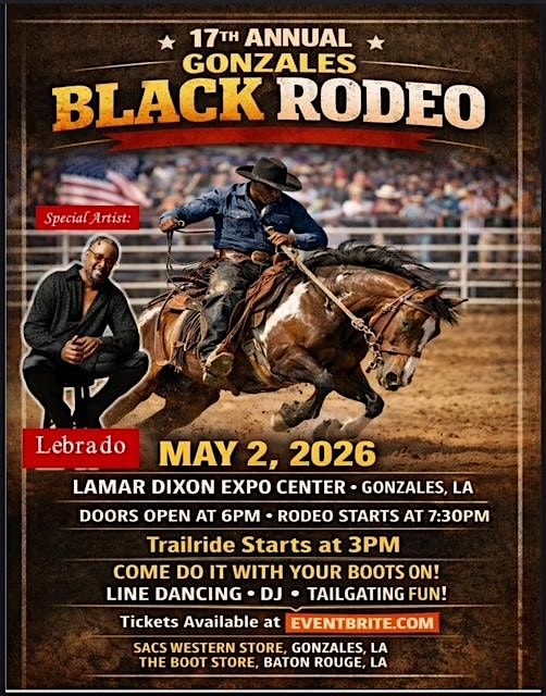 Boots on the ground ! Don't miss the 17th Annual Gonzales Black Rodeo .. wild rides & vibes, plus Lebrado performing his hit "Fire"!