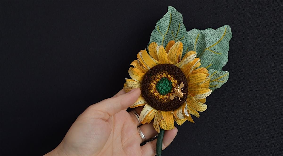Bring a friend and create a beautiful paper and fiber sunflower brooch or barrette. We will make the petals and leaves from gouache-painted pages of an 1800's Kansas Atlas and embroider the seed bed with yarn to make wearable sunflowers. Each of these mini masterpieces will be one of a kind and unique to you. This is a beautiful souvenir to remember your time in Kansas. It can be made into a barrette or a brooch. Small and easy to stow or ship, they make perfect gifts and mementos. All materials and easy to follow instructions will be supplied. Drinks and snacks are provided as well as tiny bee charms to finish the project.
