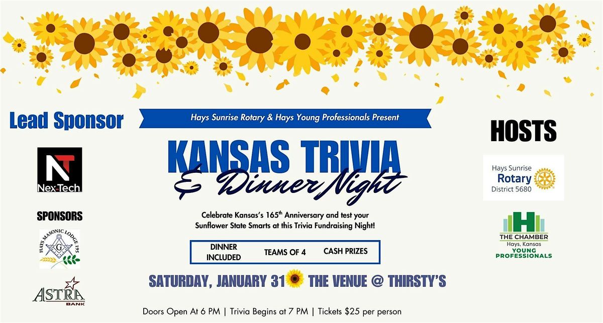 Join us as we celebrate Kansas’s 165th anniversary of statehood with an evening of Kansas-themed trivia, great food, prizes, and community spirit! The Kansas Trivia & Dinner Night brings together teams of local trivia lovers for a fun, festive competition while supporting the service projects of Sunrise Rotary of Hays.