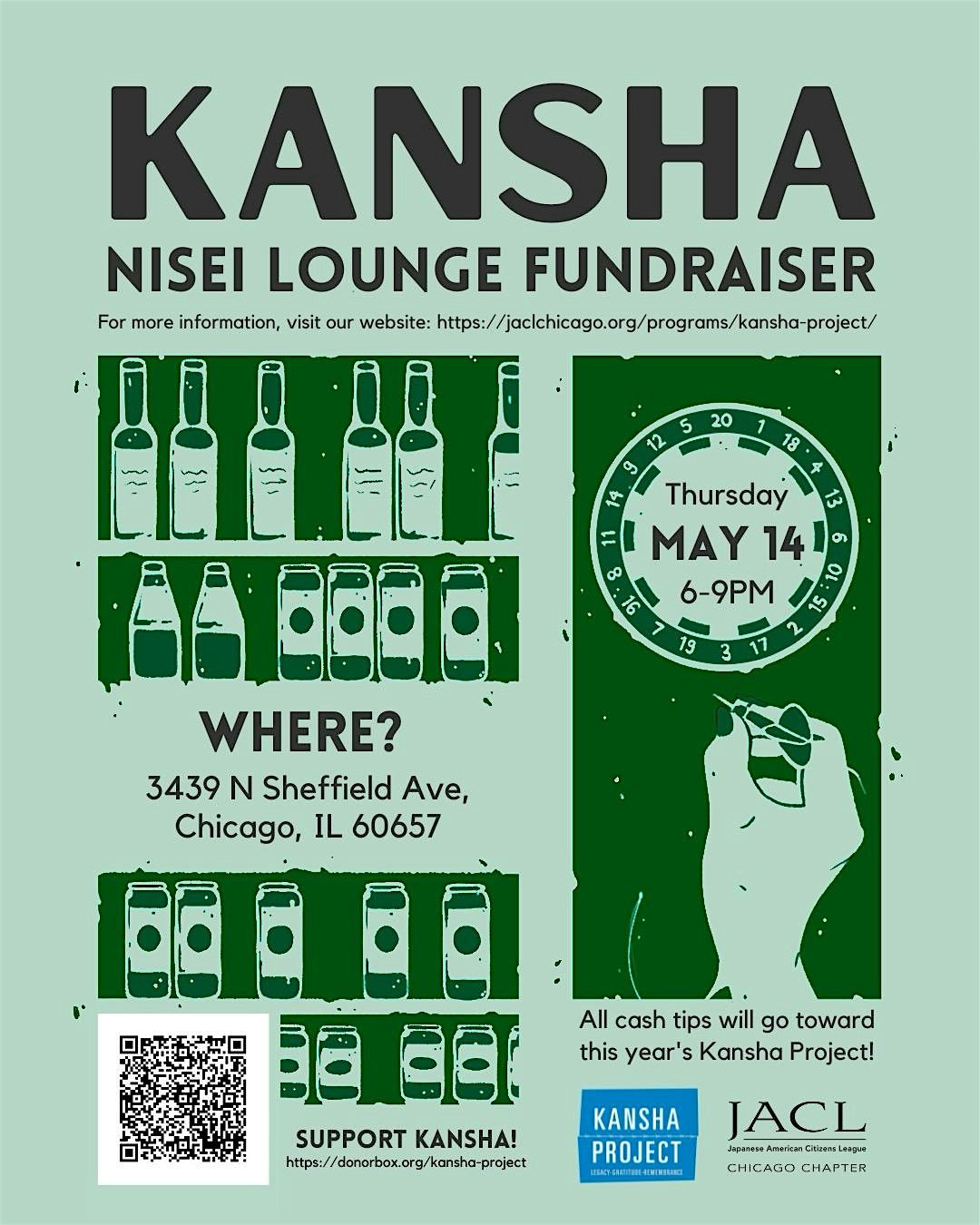 All cash tips will go towards the Kansha Project program. The Kansha Project is a JACL Chicago program that connects self-identified Japanese Americans, ages 18-25, to the continuing legacy of the Japanese American community’s incarceration during World War II. The program centers around an educational trip to Los Angeles’ Little Tokyo neighborhood and Manzanar National Historic Site. Learn more : https://jaclchicago.org/programs/kansha-project/