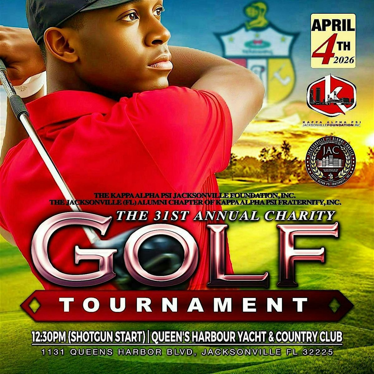 The Kappa Alpha Psi Jacksonville Foundation, Inc. will host the 31st Annual Charity Golf Tournament at Queens Harbour Yacht & Country Club on April 4, 2026. We will have a 1:00pm shotgun start. The tournament will be a four person, best ball scramble. The entry fee per golfer includes green and other applicable fees including range balls for practice. The tournament's top finishers will be recognized and awarded appropriate trophies. There will be a contest for putting, the longest drive, and closest to the pin. There will be a 50/50 raffle for a chance to win cash. This fundraising event will be held during our local chapter's centennial celebration year.