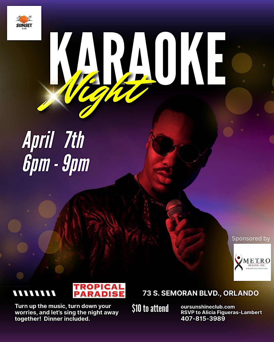 Join us for an epic evening full of fun, laughter, and great tunes. Whether you’re a shower singer or a stage pro, this in-person event is your chance to shine and belt out your favorite songs. Bring your friends, grab the mic, and let's make some unforgettable memories together. Don’t miss out on the best sing-along party in town! For more info contact Alicia 407-815-3989