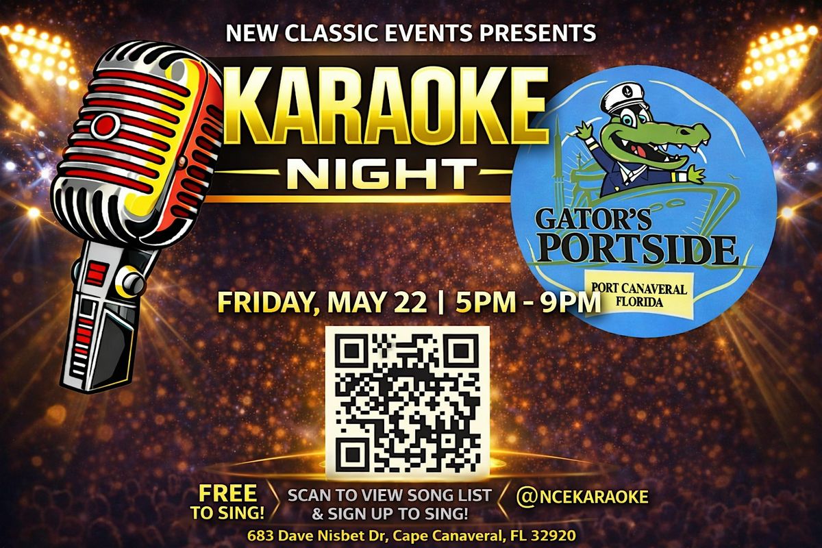 Get ready for a fun evening at Gator's Portside Port Canaveral! Join us on Friday, May 22, 2026 at 5:00 PM (Eastern Time) for a high-energy karaoke night where you can sing your heart out or just cheer on your friends. Bring your best tunes and good vibes—it's all about having a blast in an amazing atmosphere. Don’t miss out on this awesome chance to unwind and make some memories!