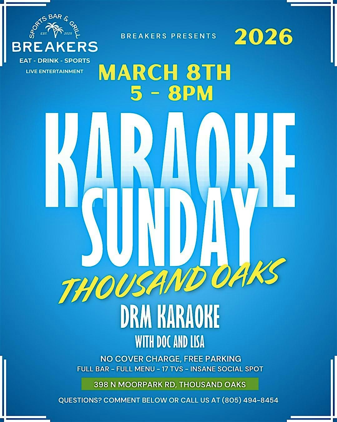 Looking for things to do in Thousand Oaks on Sunday? Join us at Breakers Sports Bar & Grill for an afternoon of live karaoke with DRM Karaoke featuring Doc & Lisa.