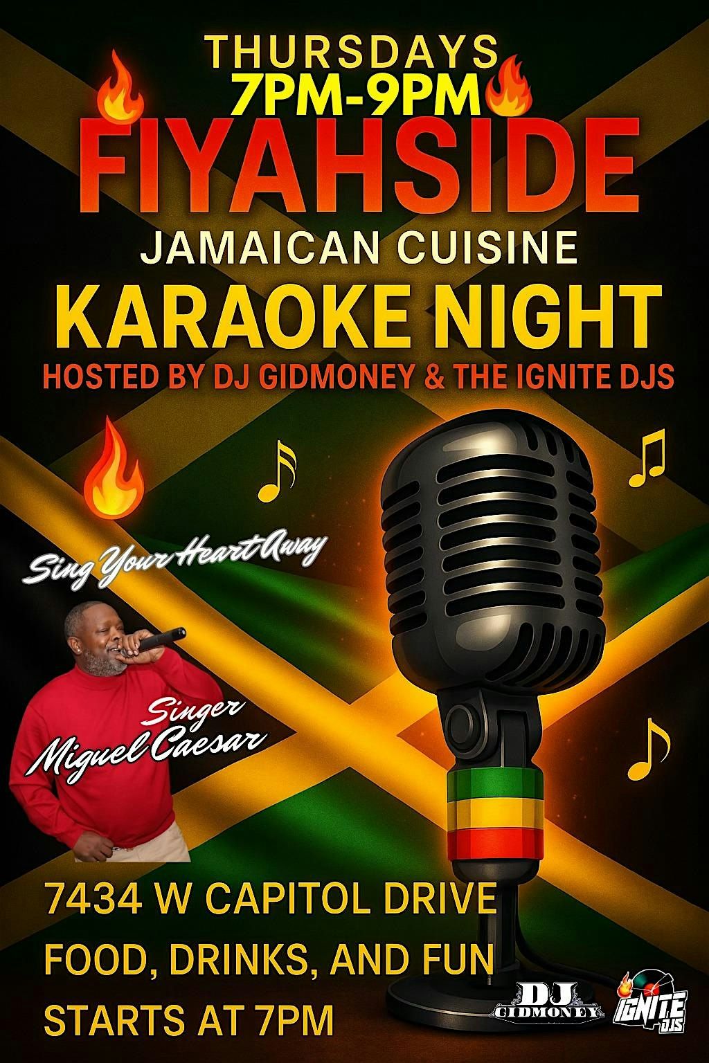 Come join us for a night of singing, fun, and good vibes at Fiyahside Jamaican Cuisine! Every Thursday, we turn up the music and let YOU take the stage. Show off your vocal skills or just enjoy the show with some delicious Jamaican food and drinks. It's the perfect midweek pick-me-up! Grab your friends and head over to Fiyahside Lounge for a memorable night of karaoke. See you there! MUSIC BY DJ GIDMONEY + THE IGNITE DJS & HOSTED BY LOCAL SINGER MIGUEL CAESAR