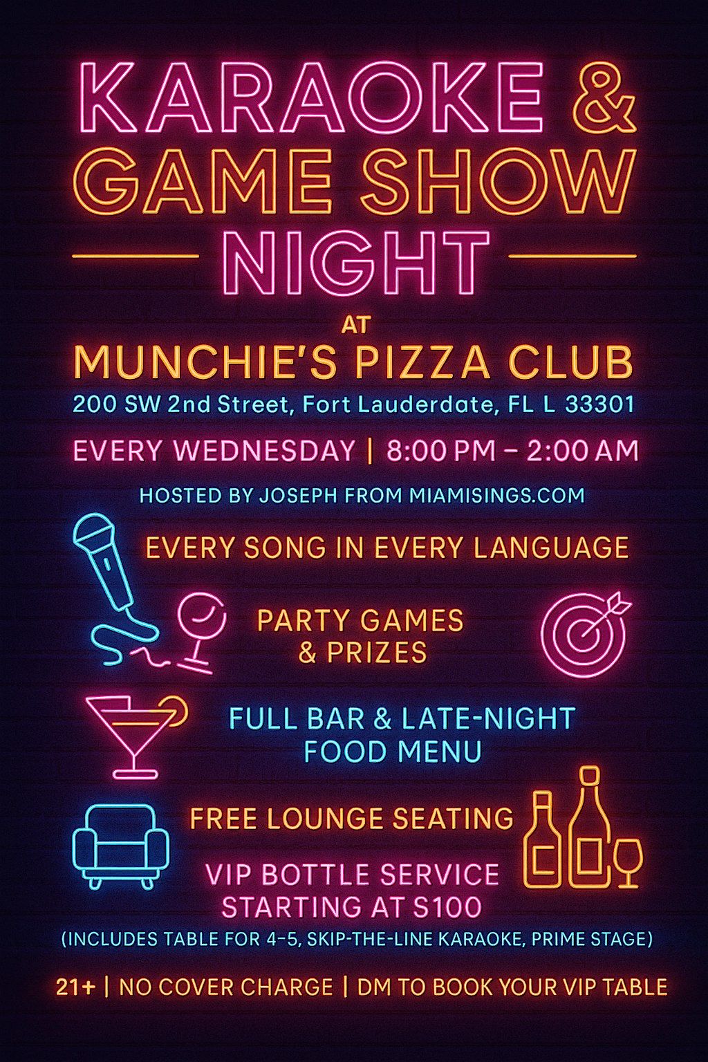 Doors open early for karaoke sign-ups and team formation! Get your free tickets now and secure your spot for the wildest Wednesday night in Fort Lauderdale!"