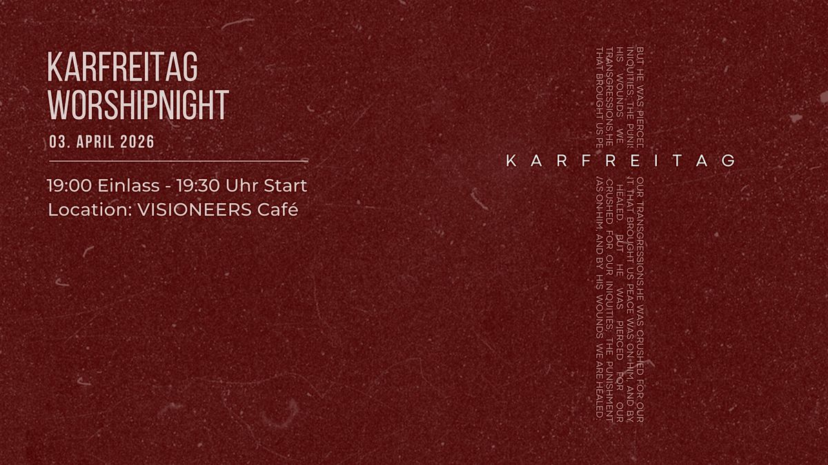 An Karfreitag erwartet dich eine kraftvolle Worshipnight in wunderschöner Atmosphäre in unserem Café. Wir wollen zusammen Jesus anbeten und uns vor Augen führen, was er für uns am Kreuz getan hat. Freu dich auf ausgedehnte Worshipzeiten, Abendmahl, einen kurzen Input und vor allem auf eine Begegnung mit Gott!