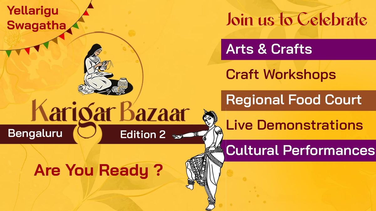 After a remarkable first edition, Karigar Bazaar comes back with an even grander showcase of India’s living craft traditions.What’s New This Year• Launch of the Karigar’s Experience Center—a first-of-its-kind interactive craft zone.• 200 master craftspeople from across India, with 50% being national awardees and renowned craftswomen.• Live craft demonstrations and daily folk performances (12 PM – 7 PM).• Weekday workshops for all age groups (4 PM – 6 PM).• Regional food court featuring authentic flavors from across the country.Yellarigu Swagatha. Join us to celebrate craft, culture, and community—together, once again.