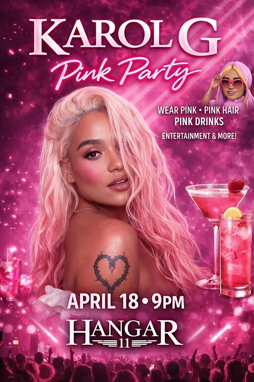 Get ready for an epic night at Hangar 11 Burgers & Brews! Join us on April 18, 2026 at 10:00 PM (ET) for a fun tribute party featuring the Karol G mascot. Dance, enjoy great vibes, and celebrate everything Karol G with fellow fans. Don’t miss out on this awesome in-person event where the party never stops!