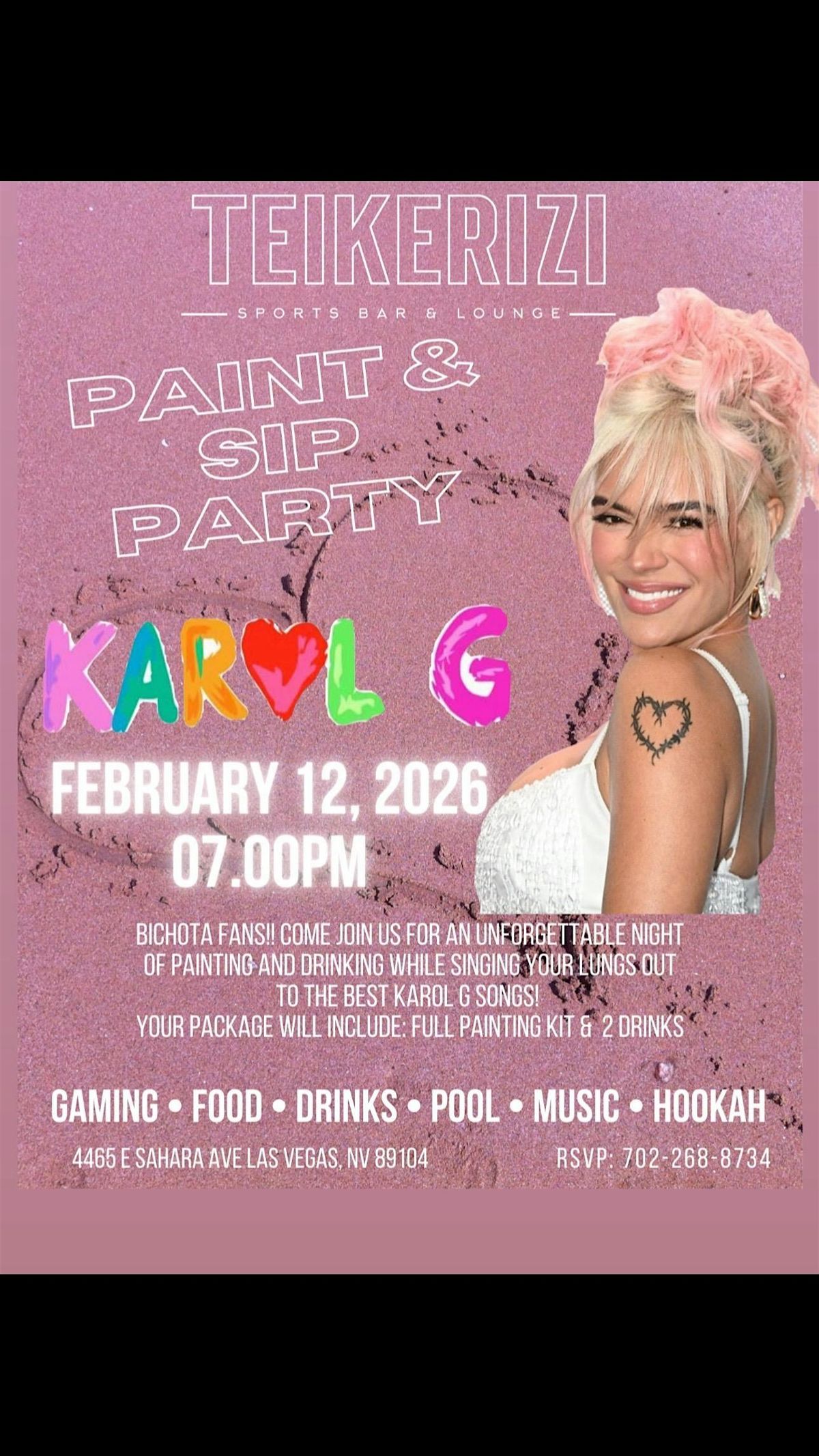 ¡Prepárate para una experiencia super divertida en Karol G Paint & Sip en Teikerizi! Ven a disfrutar de una tarde increíble, donde podrás pintar, relajarte y pasarla bien en persona con buena música y buen ambiente. No necesitas ser un artista profesional, solo trae tus ganas de crear y divertirte. ¡Te esperamos para una jornada llena de colores, risas y buena onda!