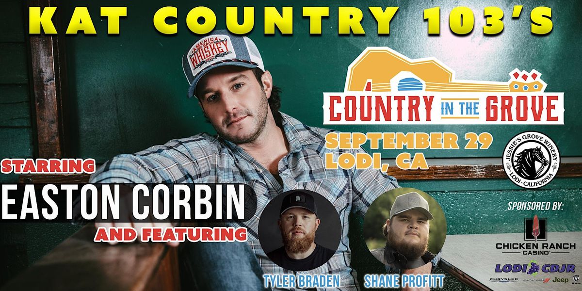 Kat Country 103 & Lodi Chrysler, Dodge, Jeep, Ram and Chicken Ranch Casino sending off the summer with one final show with Country in the Grove Show #5 coming Friday, September 28th at Jessie’s Grove Winery in Lodi featuring Easton Corbin, Shane Profitt and Tyler Braden. Join us as we say goodbye to summer 2023 with one final party.