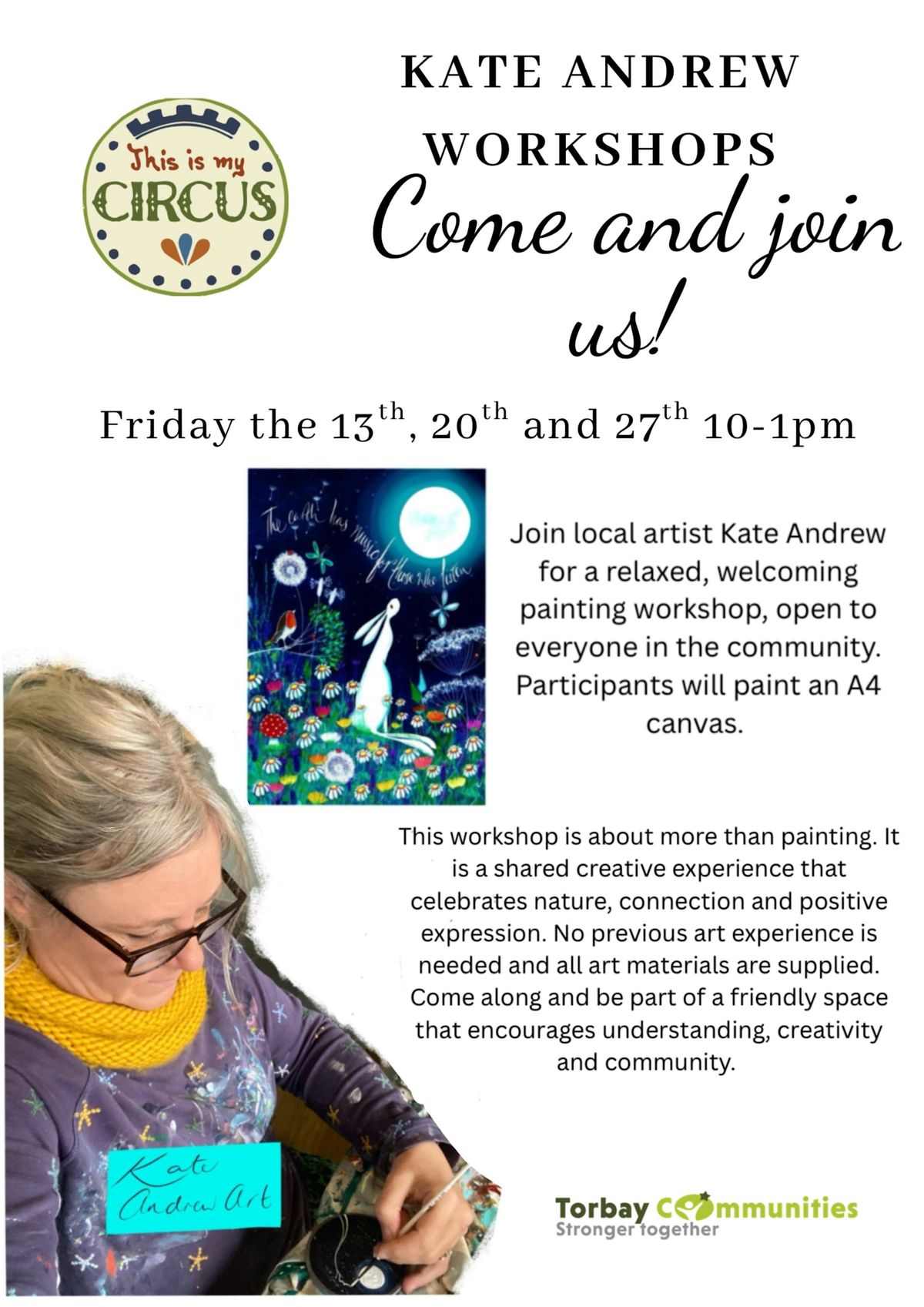 Join local artist Kate Andrew for a relaxed, welcoming painting workshop, open to everyone in the community. Participants will paint an A4 canvas.