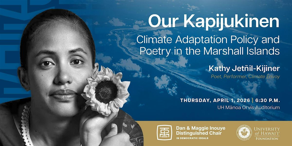 Kathy Jetn̄il-Kijiner is the spring 2026 Dan and Maggie Inouye Distinguished Chair in Democratic Ideals. The program was chartered by the late senator and his wife to bring scholars, artists, and public intellectuals to Hawai‘i to share their life experiences and discuss their work on behalf of democratic ideals. The Inouye chair is administered jointly by the Department of American Studies in the College of Arts, Languages & Letters and the William S. Richardson School of Law.