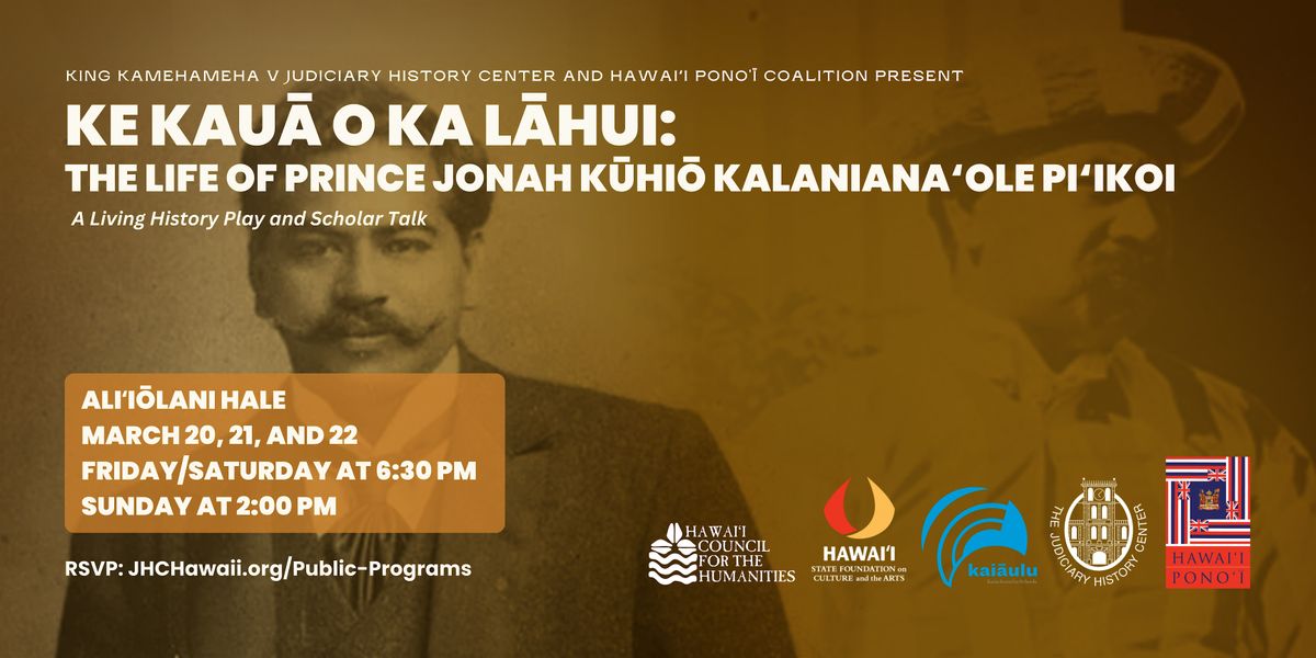 The King Kamehameha V Judiciary History Center and Hawaiʻi Ponoʻī Coalition invite you to Aliʻiōlani Hale to experience Ke Kauā o Ka Lāhui: The Life of Prince Jonah Kūhiō Kalaniana‘ole Pi‘ikoi, a living history theater performance about Prince Kūhiō’s remarkable life, from his childhood as a young aliʻi through his lifelong commitment to improving the welfare of the people of Hawaiʻi.