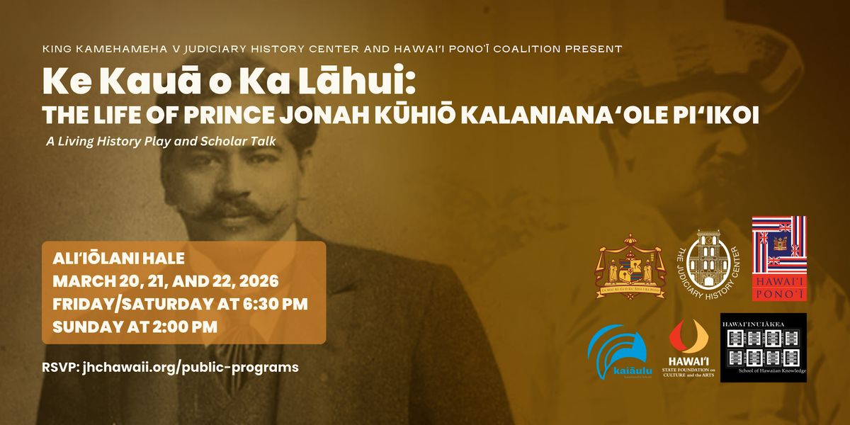 The King Kamehameha V Judiciary History Center and Hawaiʻi Ponoʻī Coalition invite you to Aliʻiōlani Hale to experience Ke Kauā o Ka Lāhui: The Life of Prince Jonah Kūhiō Kalaniana‘ole Pi‘ikoi, a living history theater performance about Prince Kūhiō’s remarkable life, from his childhood as a young aliʻi through his lifelong commitment to improving the welfare of the people of Hawaiʻi. Featuring cast: J. Kamamo Bailon, Maya Mahinalani Berengue, James Keawe Bright, Alaka’i Kevin Cunningham, Kealaula “Lala” Faifili, and Charles Kupahu Timtim.