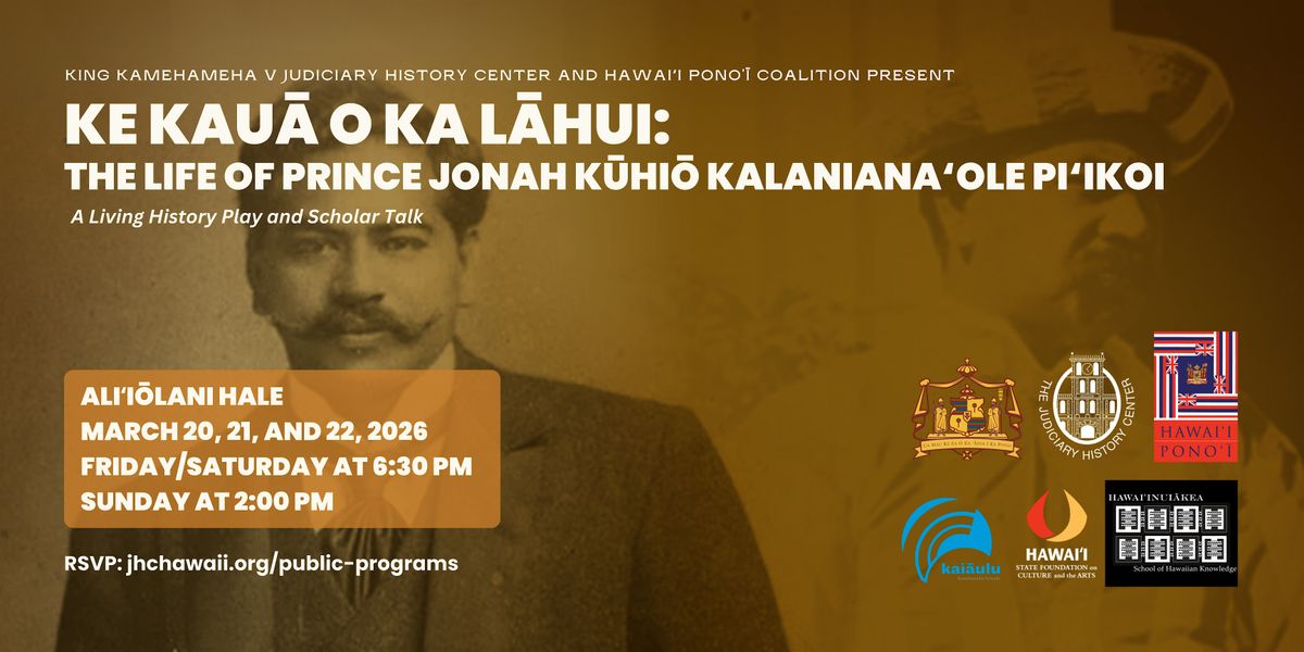 The King Kamehameha V Judiciary History Center and Hawaiʻi Ponoʻī Coalition invite you to Aliʻiōlani Hale to experience Ke Kauā o Ka Lāhui: The Life of Prince Jonah Kūhiō Kalaniana‘ole Pi‘ikoi, a living history theater performance about Prince Kūhiō’s remarkable life, from his childhood as a young aliʻi through his lifelong commitment to improving the welfare of the people of Hawaiʻi. Featuring cast: J. Kamamo Bailon, Maya Mahinalani Berengue, James Keawe Bright, Alaka’i Kevin Cunningham, Kealaula “Lala” Faifili, and Charles Kupahu Timtim.