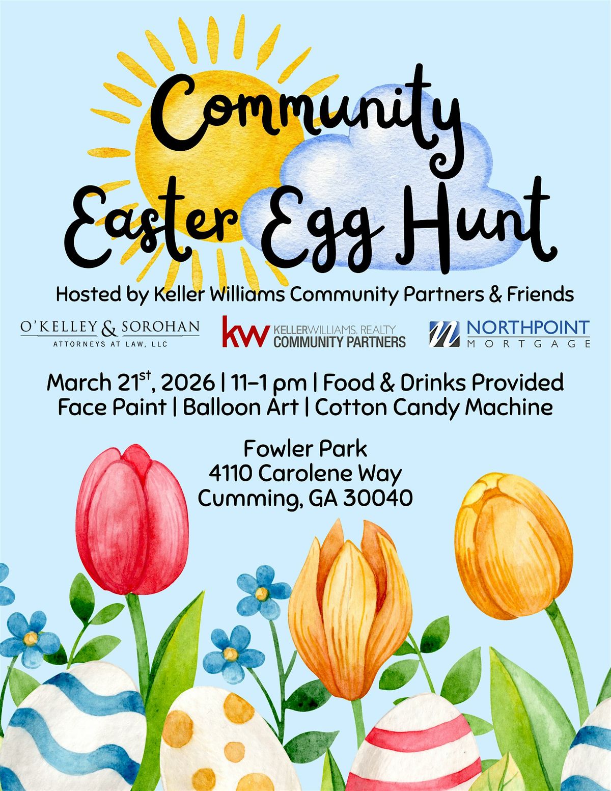 Please come out and enjoy an egg hunt, food, balloon art, cotton candy machine, face painting, and yard games! Let's celebrate spring together. This is a great event for the whole family! This event is sponsored by NorthPoint Mortgage, O'Kelley and Sorohan, and Keller Williams Community Partners.