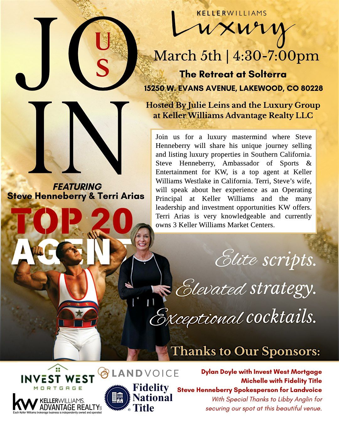This elevated evening will feature Steve Henneberry, Ambassador of Sports & Entertainment for Keller Williams and a Top 20 KW Agent, as he shares his journey selling and listing luxury properties in Southern California. Learn the strategies, scripts, and mindset that have positioned him at the top of the industry.