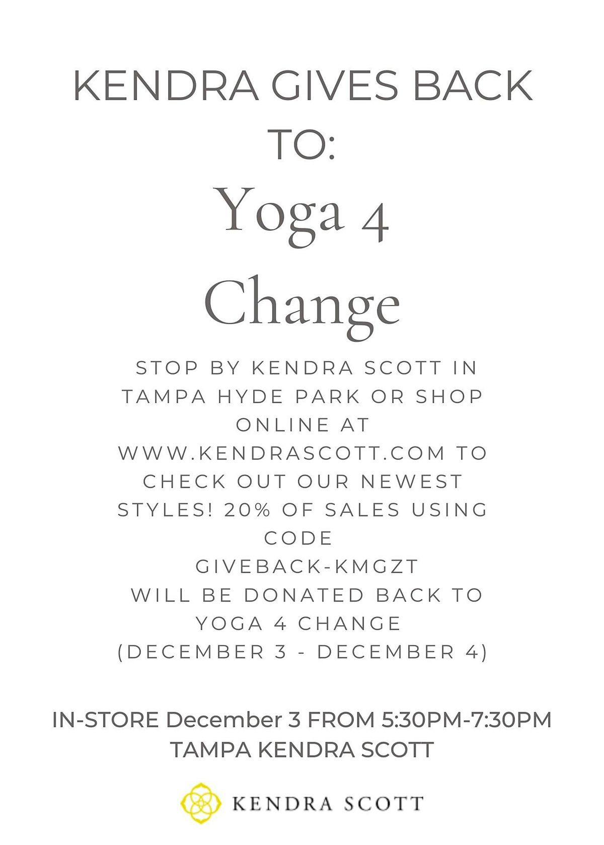 Come join us for a special event at Kendra Scott in Tampa where we will be hosting a 'sip & shop' mixer to support Yoga 4 Change, a non-profit organization that offers trauma-infrmed yoga and mindfuless programs to underserved communities. It's a great opportunity to give back just in time for Mother's Day.