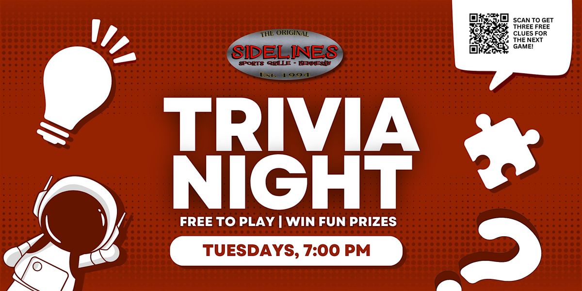 Join us for free live trivia every Tuesday at 7pm at Sidelines Sports Grille, located at 840 Ernest W Barrett Pkwy NW, Kennesaw, GA 30144! Free to play, and top teams win fun prizes!