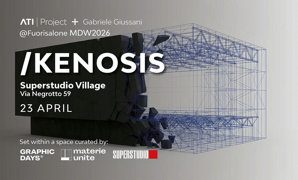 KENOSIS esplora la soglia dove tecnologia e pensiero si incontrano. Due talk in formato breve — seguiti da tavole rotonde aperte — attraversano i temi che stanno ridefinendo il processo architettonico e creativo contemporaneo: dall'algoritmo generativo ai nuovi materiali, dall'Antropocene al Tecnocene, dalla forma emergente alla creatività come gesto condiviso tra umano e macchina. Un confronto tra studi di architettura, ricerca accademica e pratica artistica, trasmesso in streaming e aperto al pubblico.