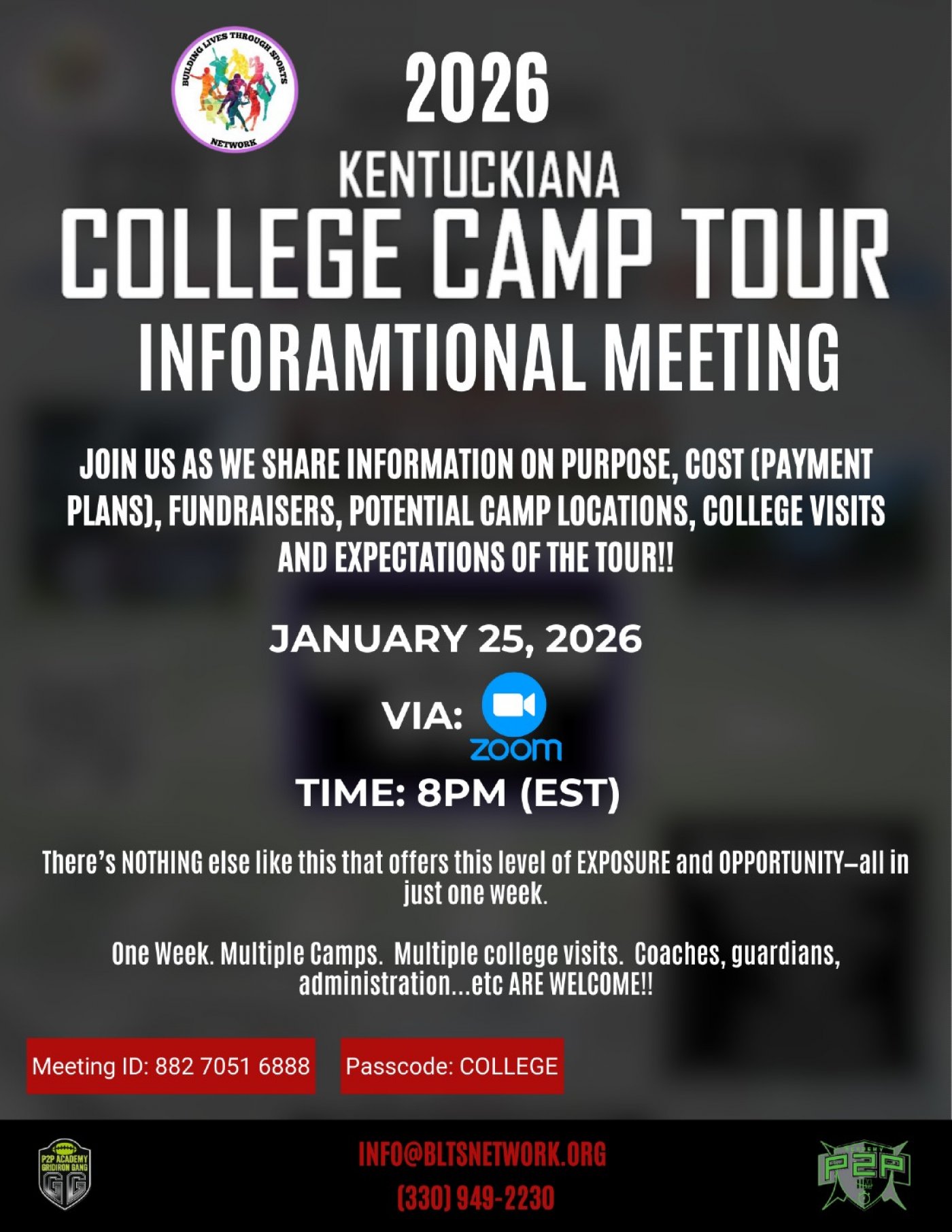 We at Building Lives Through Sports Network in conjunction with Perform To Perfection Academy, INC. would like to invite you to the Kentuckiana College Camp Tour informational meeting.