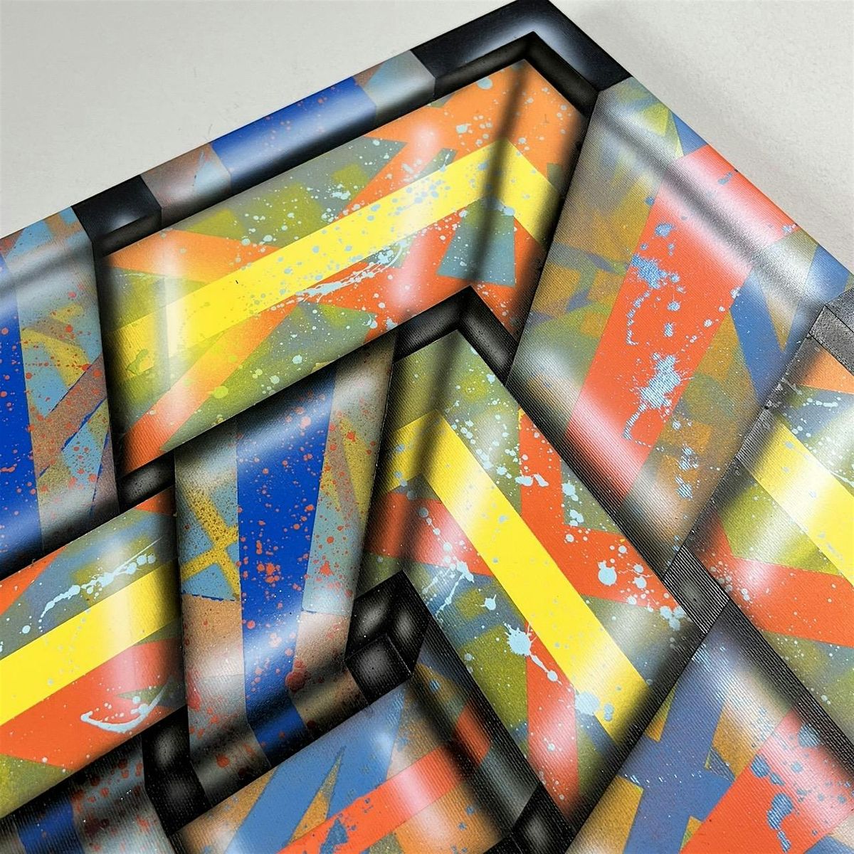 Pollack’s work is built through repeated layers of spray paint, masking, and controlled fades. Each canvas develops slowly, moving from loose color fields into hard geometric structures. Depth, movement, and tension push against each other to form the final image. Spheres, tunnels, fractured grids, and mirrored forms recur across the exhibition, linking the two rooms into one visual system. These works were shaped during a period of constant obstacles and heavy personal stress.