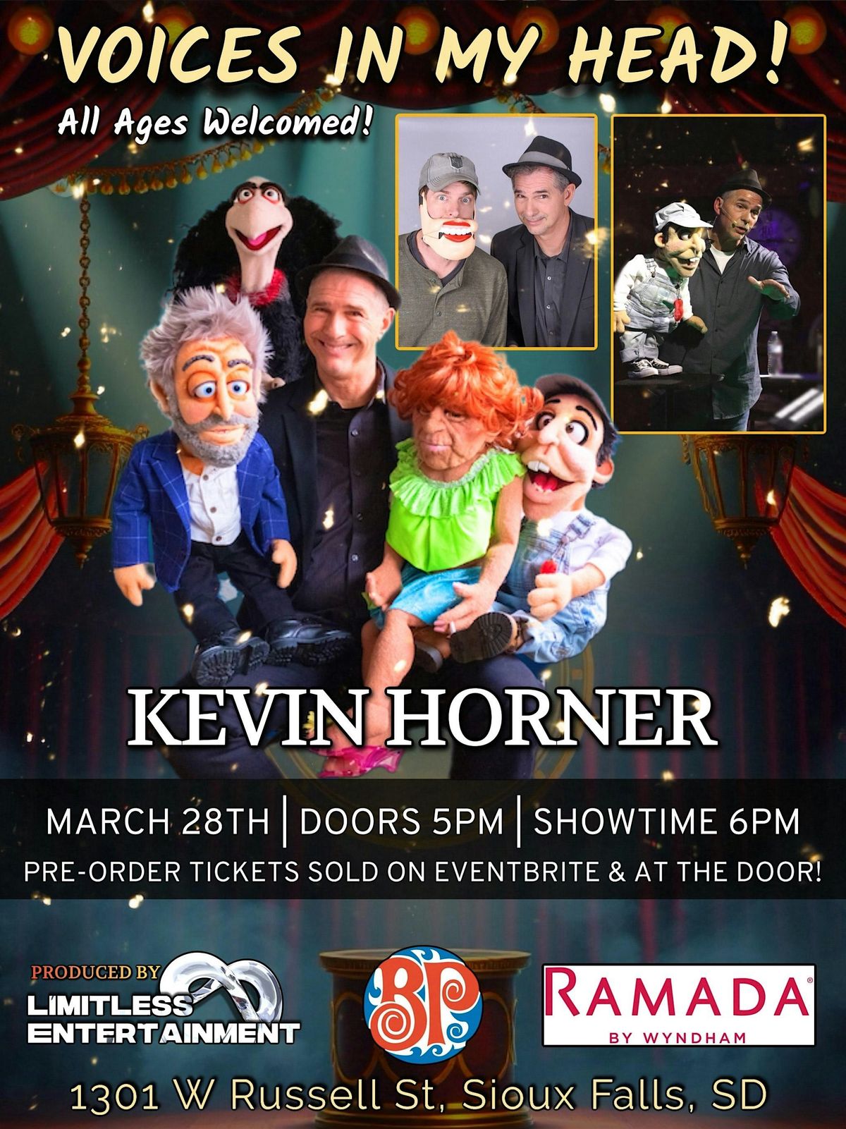 The wait is over! Limitless Entertainment is proud to announce we are bringing KEVIN HORNERS “voices in my head” tour to Sioux falls South Dakota for an unforgettable night of laughs! This event will be avalible to all ages! Kevin was Voted as Gig Masters top comedy ventriloquist 8 times! He has been a headliner at The Improv. A 3 times Peoples Choice Award winner for the art of ventriloquism. He has entertained for comedy clubs, corporations and community events throughout the United States! He only listens to the voices in his head! Come out and join us on march 28th 2026! Location is 1301 W Russell St. Sioux Falls, SD 57104 United States. See everyone there!