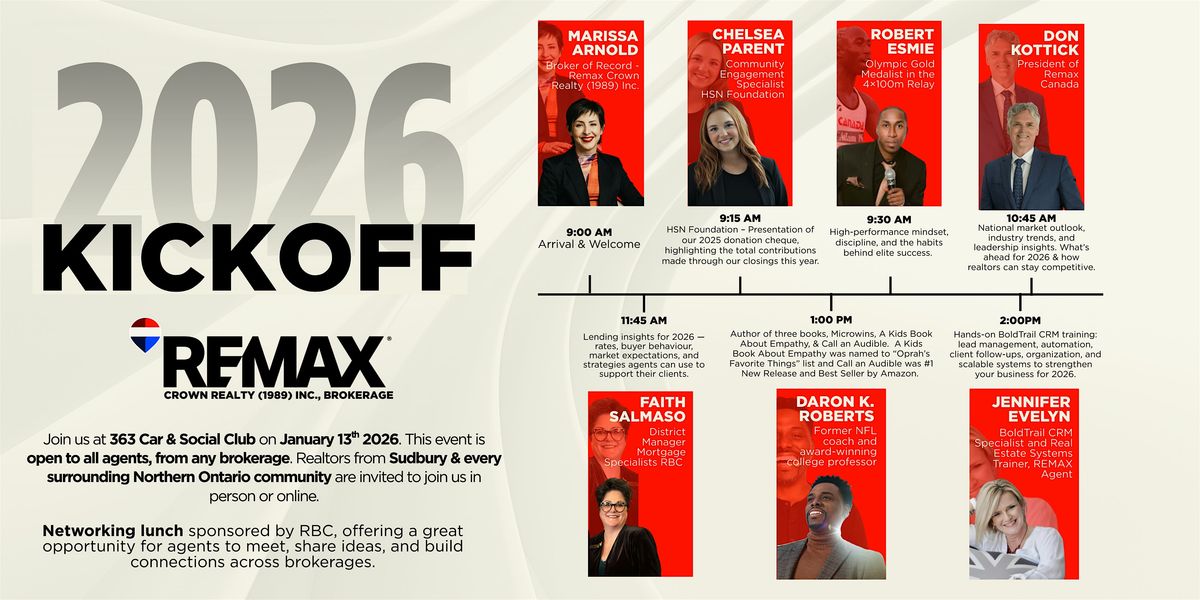 The 2026 Real Estate Kickoff is a high-impact, one-day event created for licensed real estate professionals across Northern Ontario who want to start the year with clarity, structure, and momentum.
