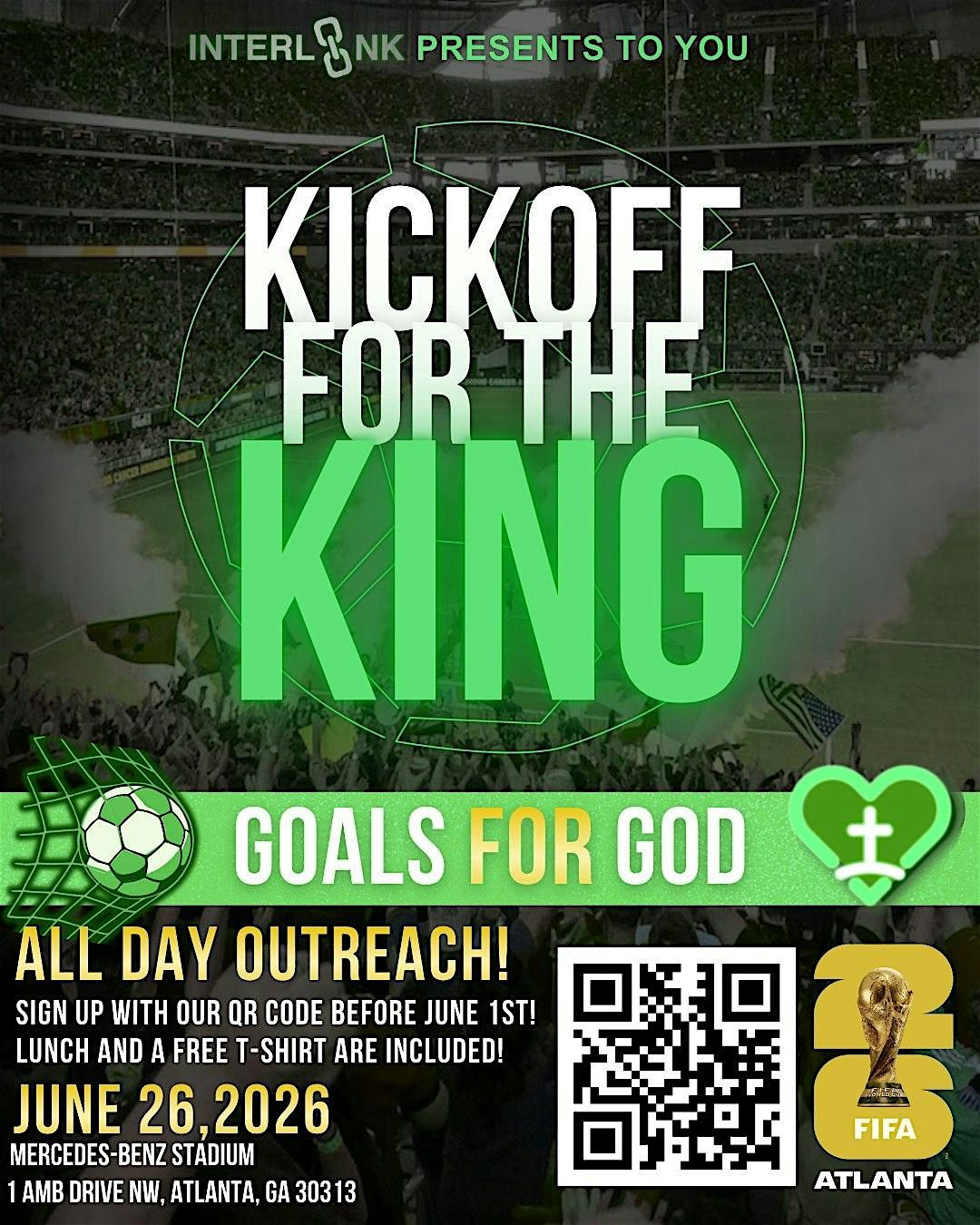 Kickoff for the King will be an evangelistic outreach in Atlanta during the World Cup match on June 26,2026. Free Lunch & T-Shirt included!