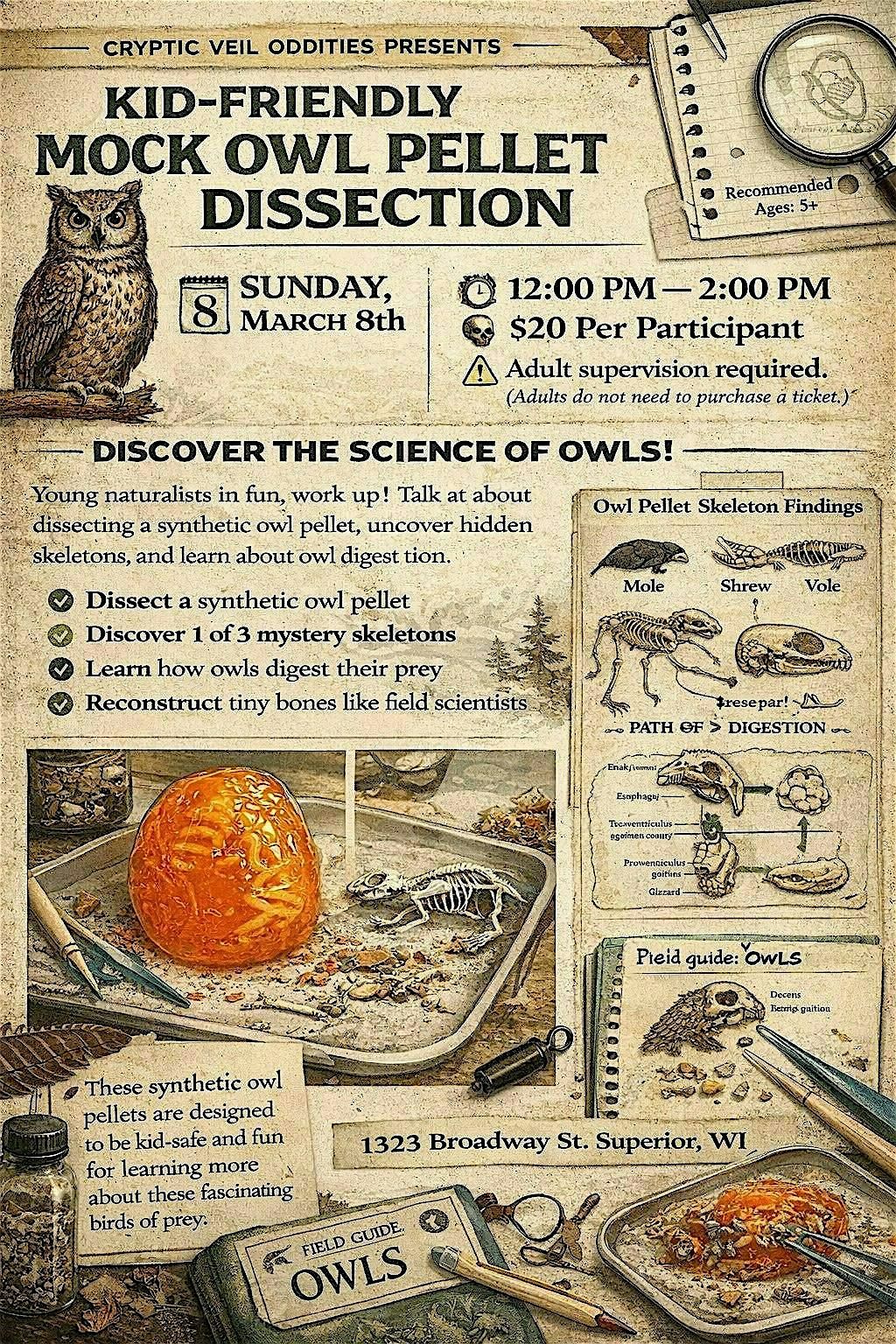 We will have the kids dissect their pellects and then build a complete skeleton with the bones they find. The attending adult does not need a ticket. Adult supervision required.