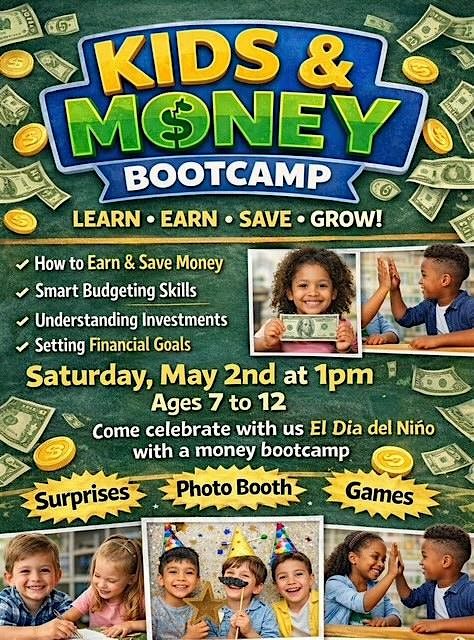Hey parents! Ready to give your little ones a head start? Join our Kids and Money Bootcamp (for kids age 7-10), an in-person event designed to make learning about money fun and easy. We'll dive into cool activities that teach saving, spending, and budgeting without the boring stuff. Bring your kiddos for a hands-on experience that'll boost their money smarts and confidence. Don't miss out on this awesome chance to empower your kids with essential life skills!