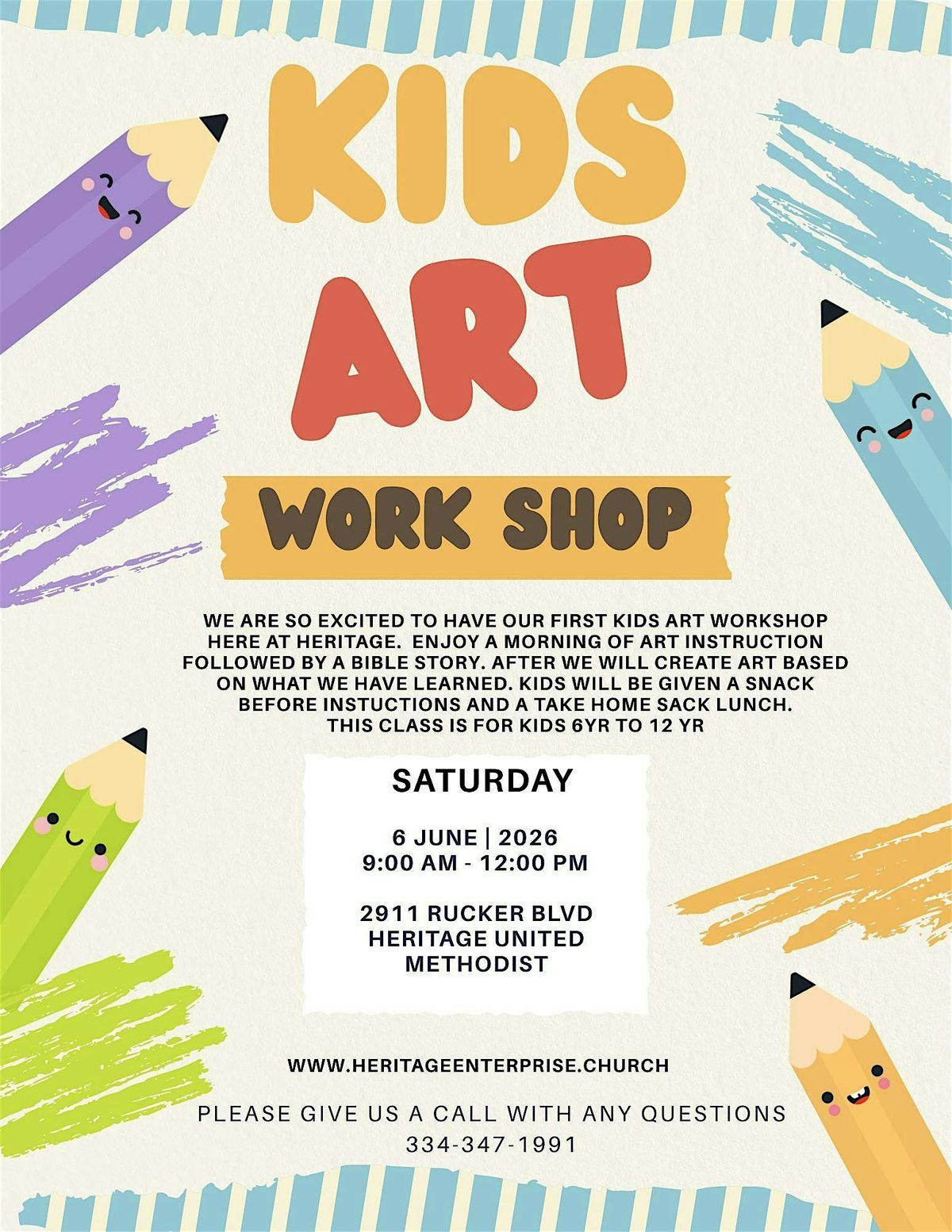 We are so excited to have our first kids art workshop here at Heritage. Enjoy a morning of Art instruction followed by a bible story. After we will create art collages based on what we have learned. Kids will be given a snack before instuctions and a take home sack lunch.