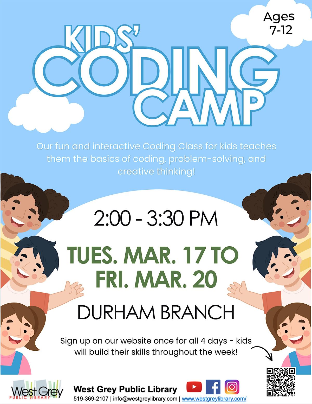 Welcome to Coding Camp! 🚀 Join us at the Durham Branch for a week filled with fun coding activities. Whether you're a beginner or an experienced coder, this camp is perfect for everyone! Come learn new skills, make friends, and have a blast. Don't miss out on this exciting opportunity to dive into the world of coding. Sign up once for all 4 days as kids build their skills through the week. See you there!