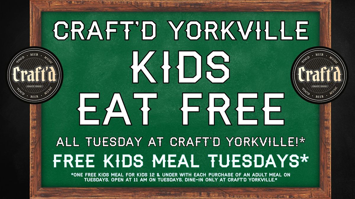 Kids Eat Free at Craft'd Yorkville with an accompanying Adult Purchase of an Entrée or Meal all Tuesday long.About this Event