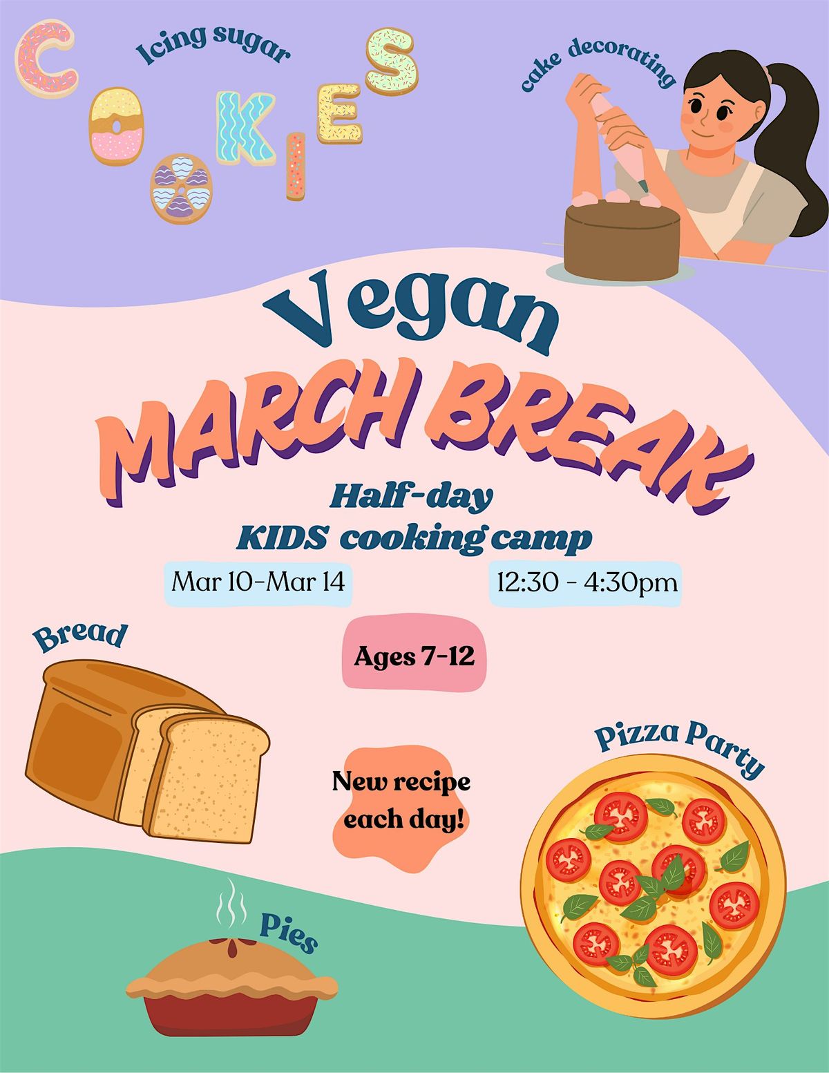 You’ll learn how to make vegan royal icing, cookie dough, pie dough, fillings, frosting, cakes, bread dough and pizza dough. A recipe booklet will be yours to take home at the end of the week.