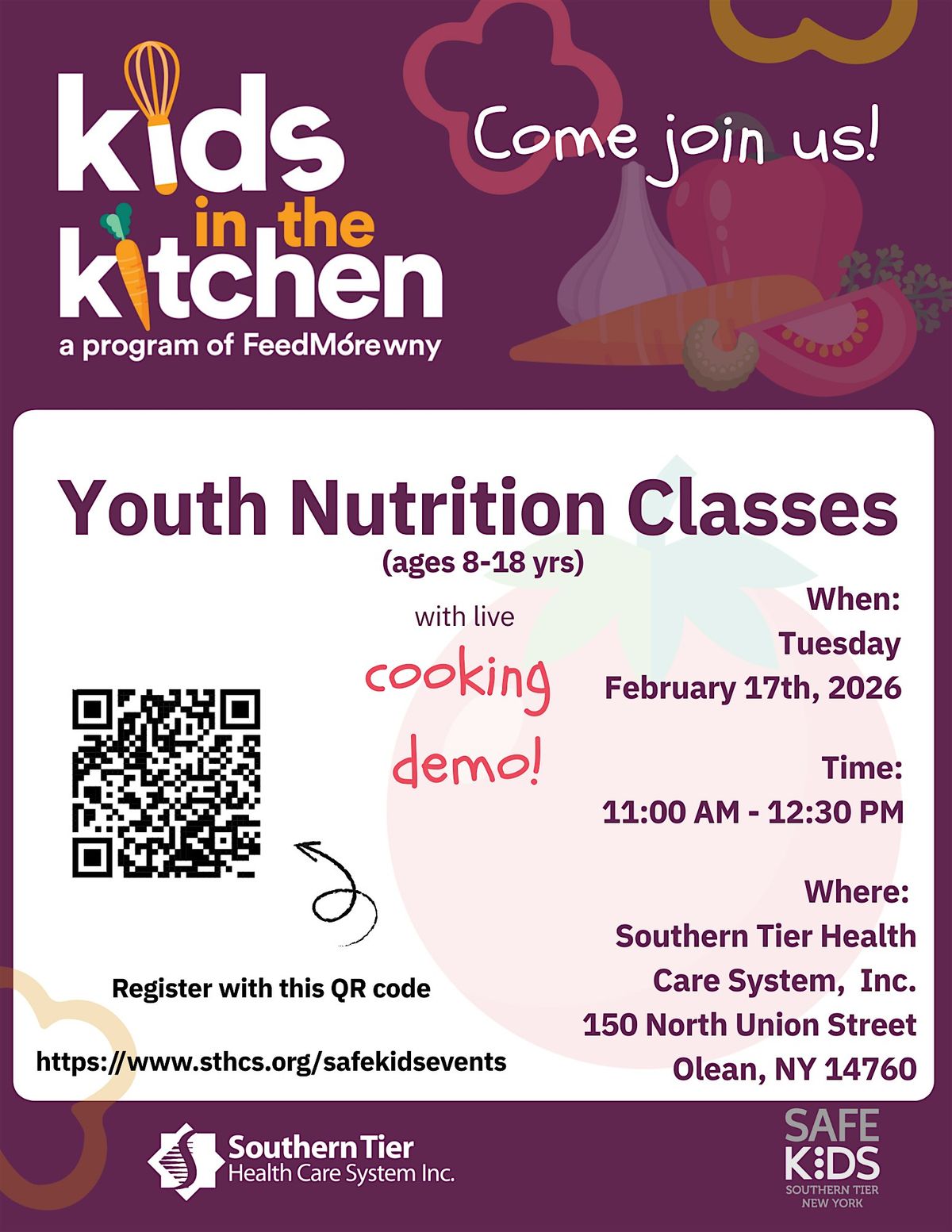 Children from the ages of 8-18 will have the opportunity to get creative in the kitchen, develop valuable cooking skills, and take home ingredients to make the recipes again. Don’t miss this fun and educational event that will inspire a love for cooking!