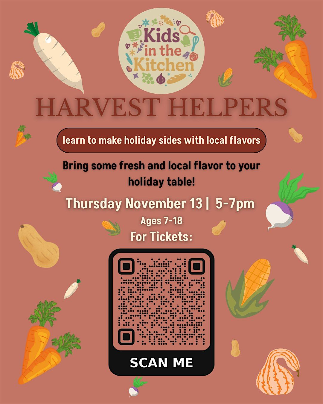 This week’s Kids in the Kitchen class is all about preparing for the holidays! Young chefs will learn how to make festive side dishes using local ingredients and seasonal flavors — perfect for sharing at your next family gathering. It’s a fun, hands-on way to celebrate fall’s harvest and explore creative cooking techniques.