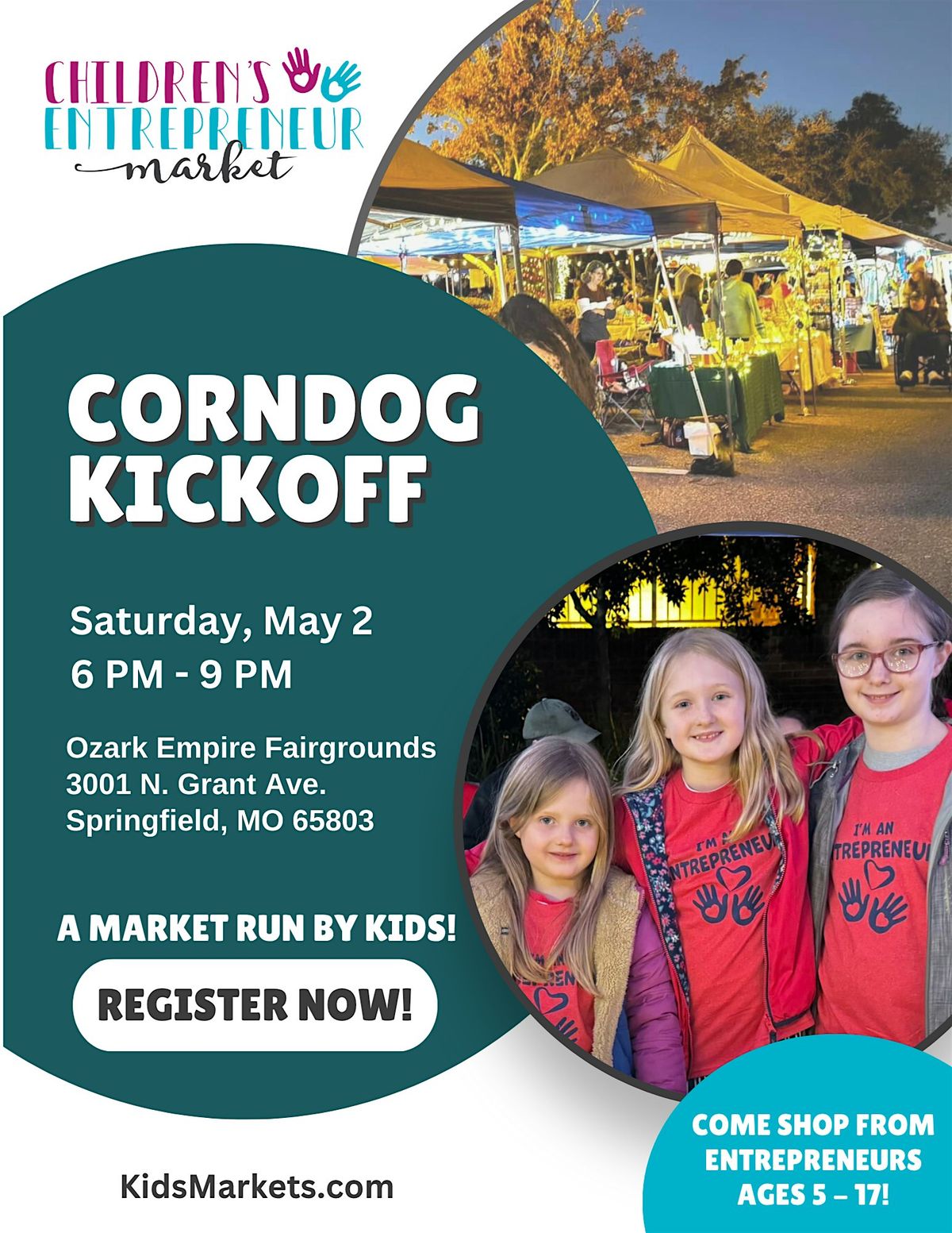Give your kids the ultimate entrepreneurial thrill at Kids Markets during Corndog Kickoff! They'll set up shop, sell their crafts or treasures, earn real cash, and feel like mini moguls amid fair food frenzy, live music, and family fun. Spots fill fast, so sign up now and watch their confidence (and piggy banks) explode! Don't miss this tasty kickoff to summer excitement!